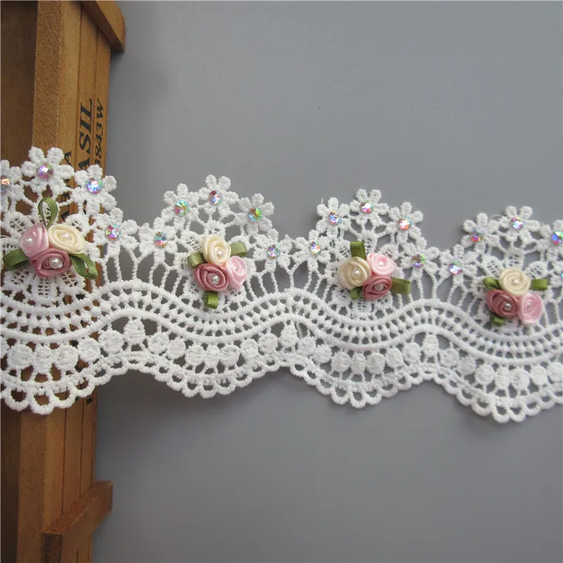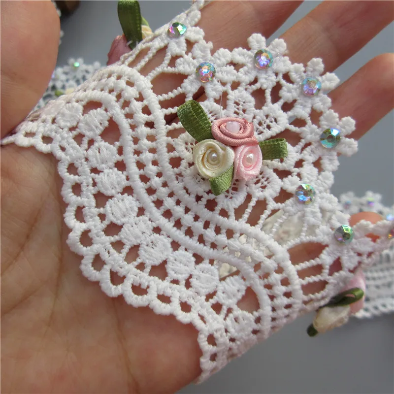 1y Soluble Cotton Flower Diamond Pearl Embroidered Fabric Lace Trim Ribbon Handmade DIY Sewing Craft For Costume Hat Decoration