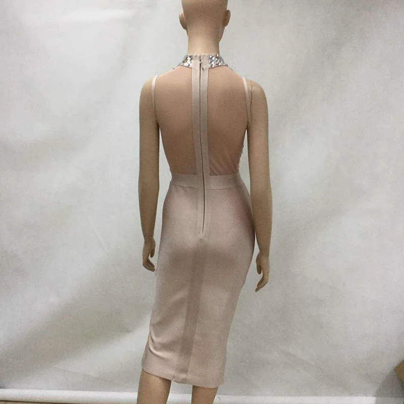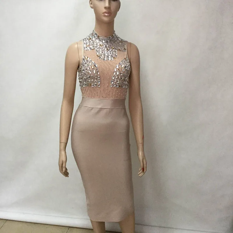 2016 Summer New Women Nude mesh Crystal sleeveless bandage dress High Neck beading diamonds Celebrity Sexy Party Dress Dropship