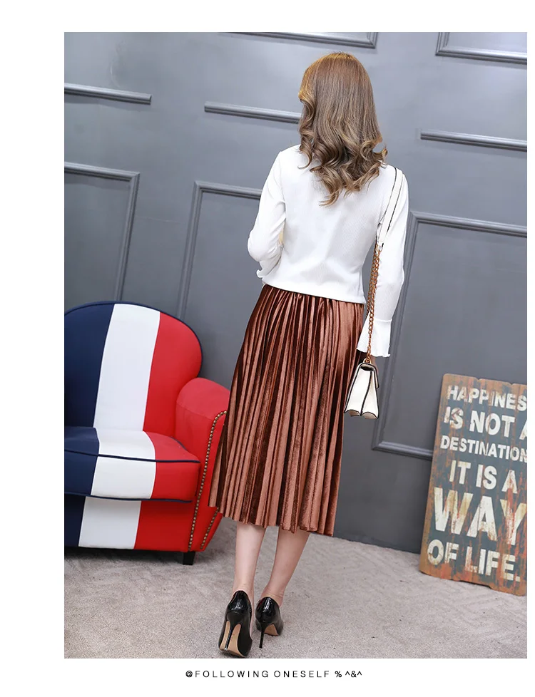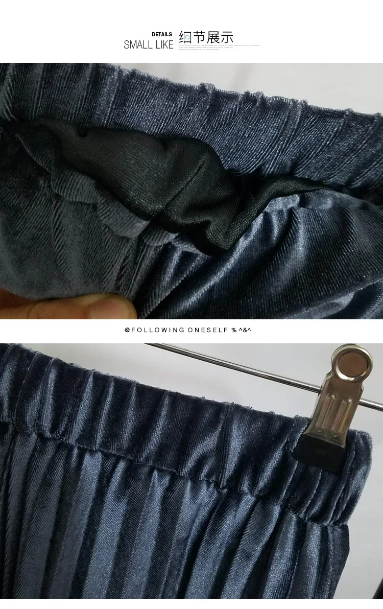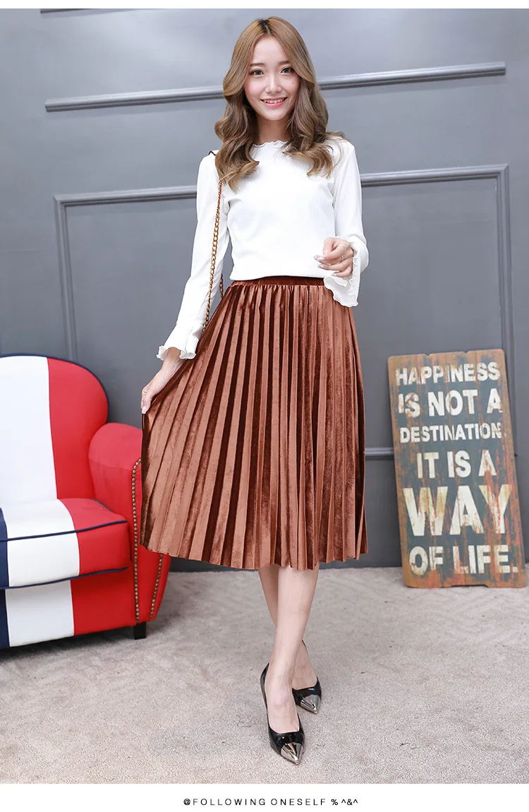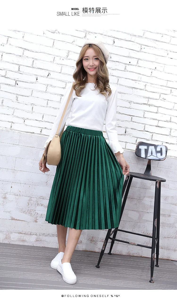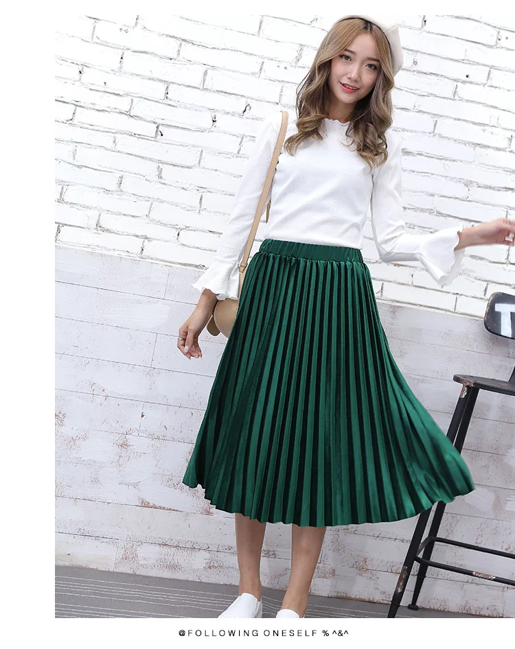 2017 Autumn Winter Velvet Skirt Fashion Long Warm Skirts High Waist Elastic Waist Pleated Skirt Jupe Femme 4 Colors