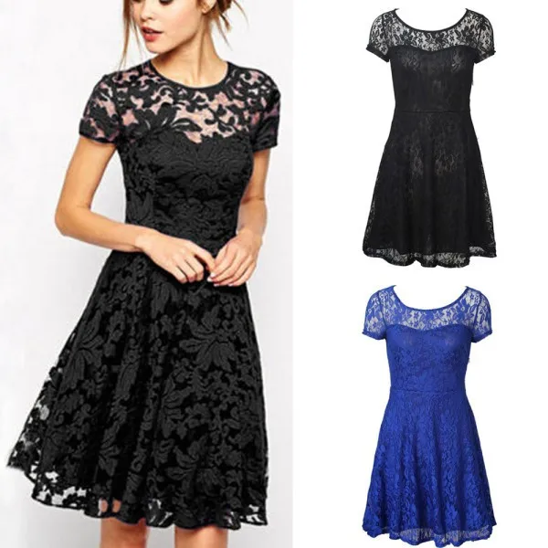 2017 New Women Floral Lace Dresses Short Sleeve Party Casual Color Blue Red Black Mini Dress Vestidos