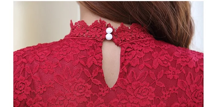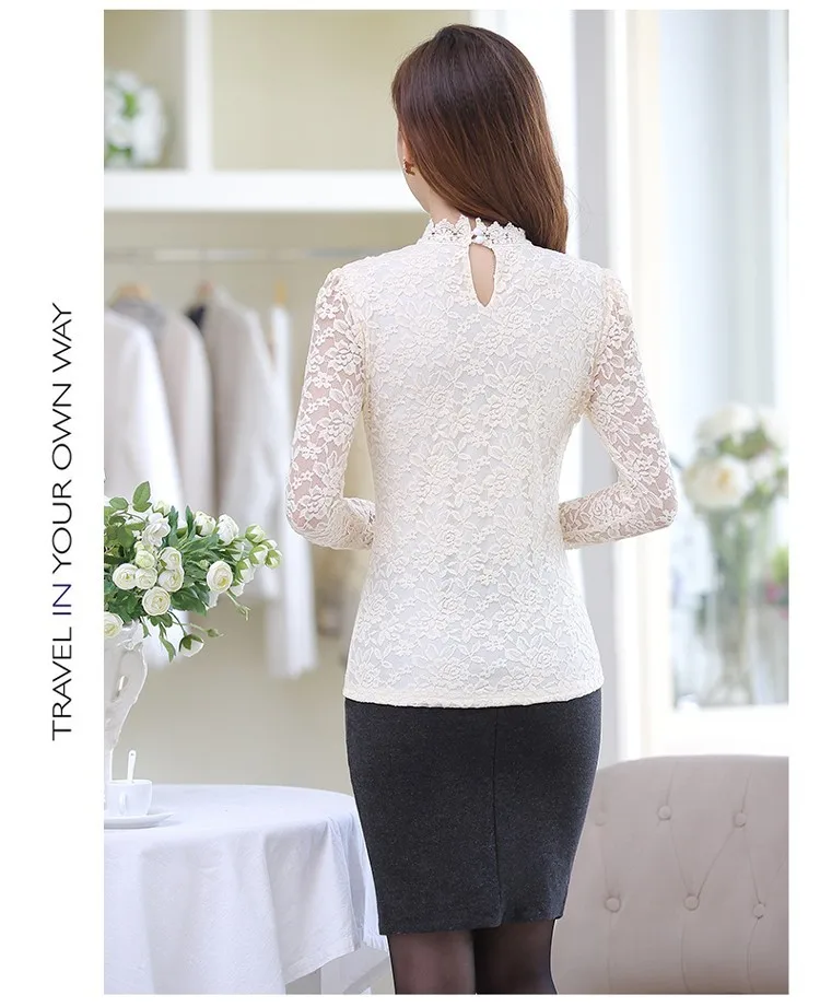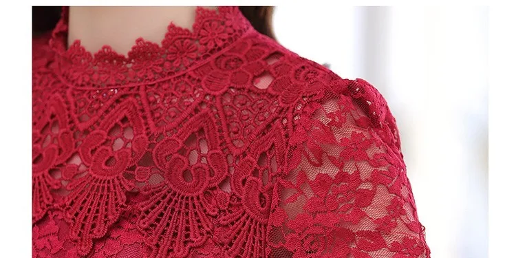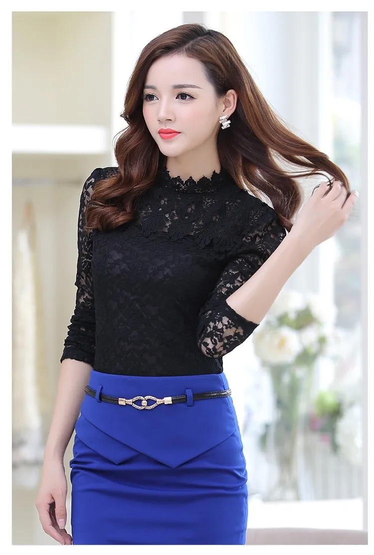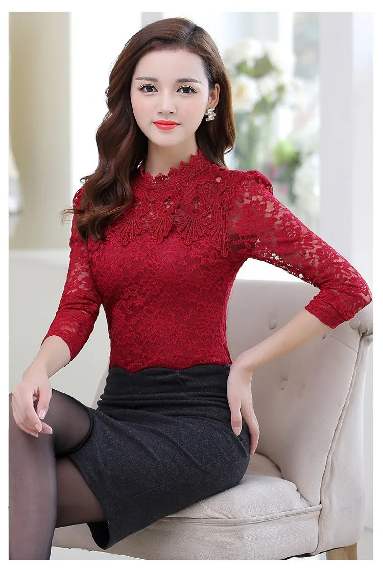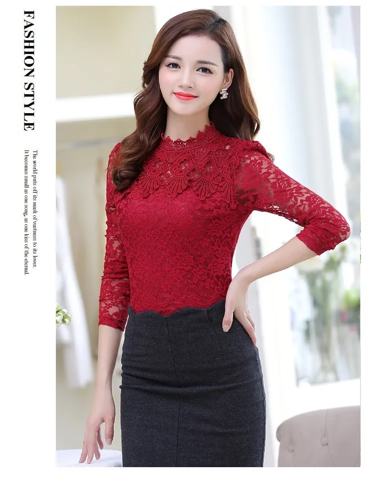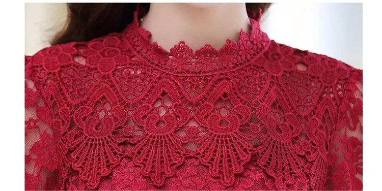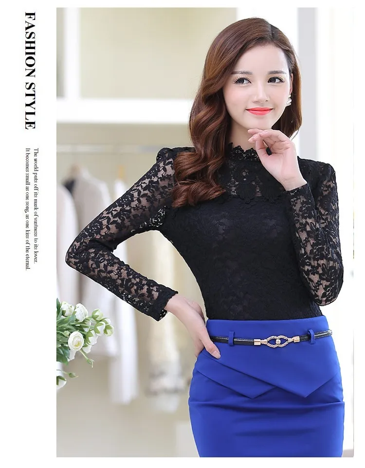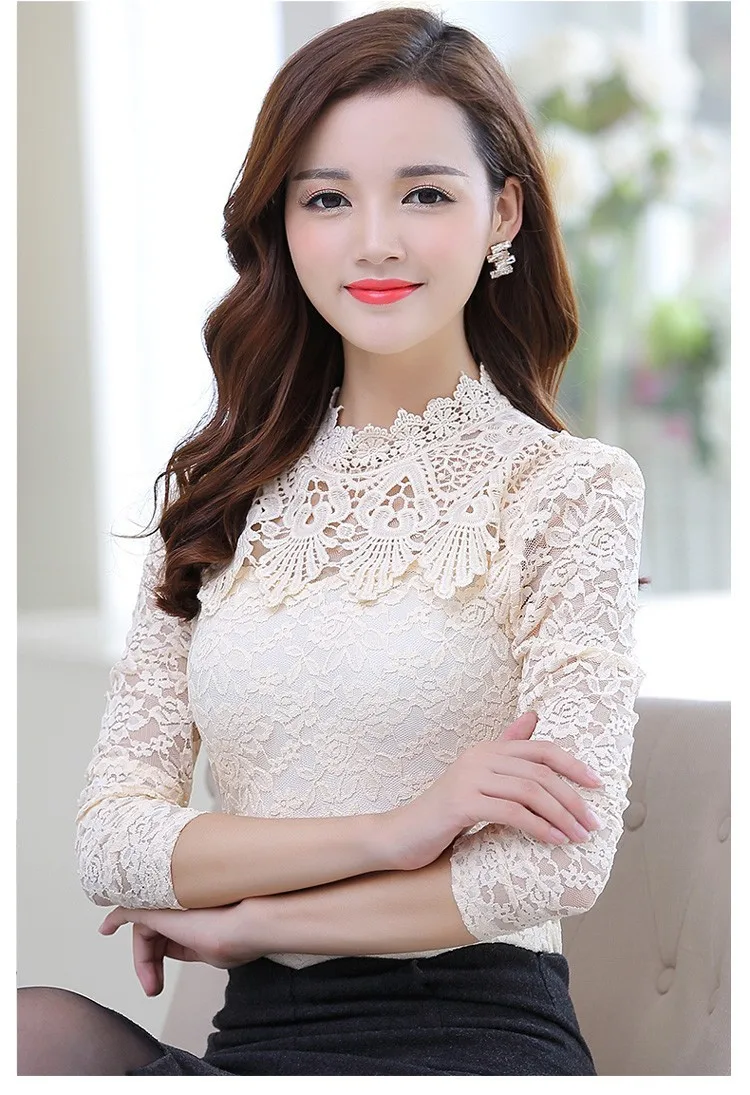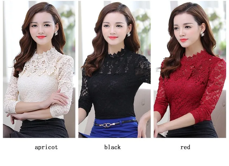 Gender: Women;Model Number: Women lace blouse;Sleeve Length(cm): Full;Pattern Type: Solid;Decoration: Lace;Material: Spandex,Polyester;Collar: Stand;B…