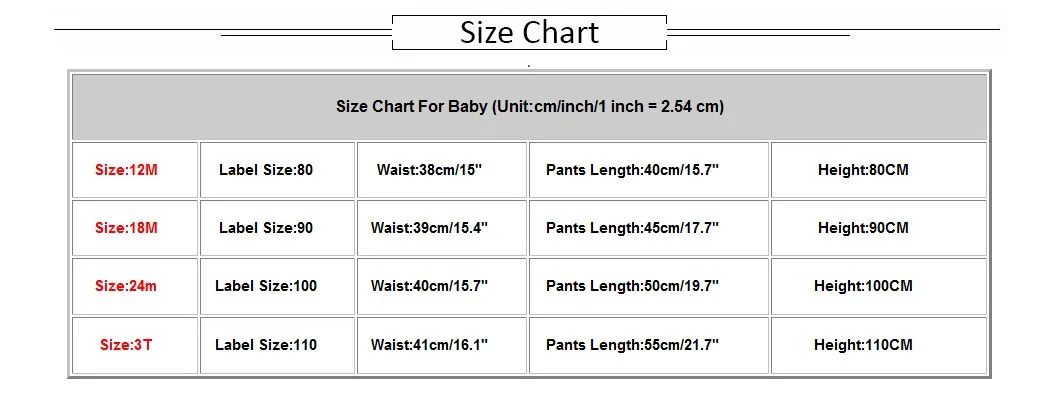 | Size:3T | Label Size:110 | Waist:41cm/16.1" | Pants Length:55cm/21.7" | Height:110CM |