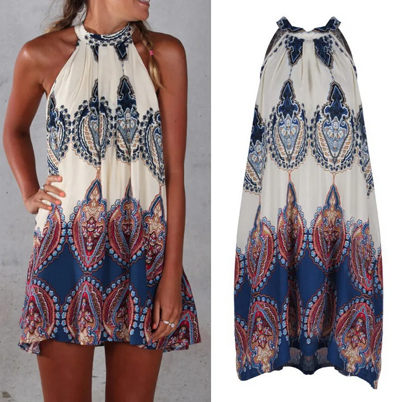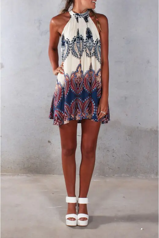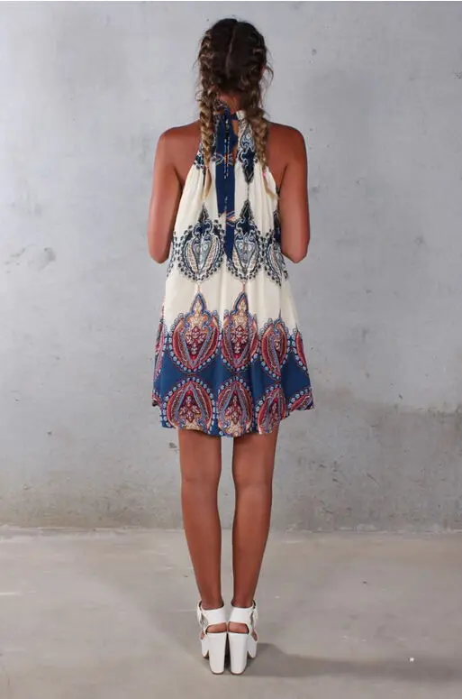 2017 Vintage Summer Dress Women Boho Short Dress Printed Halter Neck Sleeveless Beach Party Mini Dresses Beige Vestidos De Festa