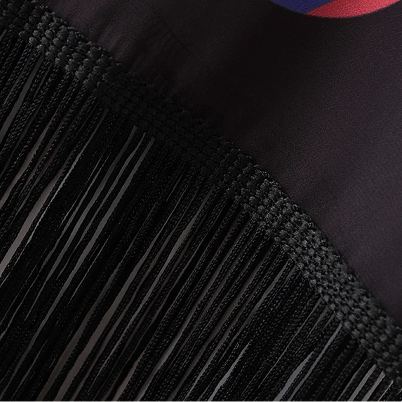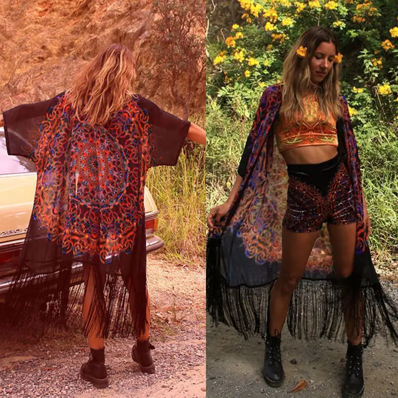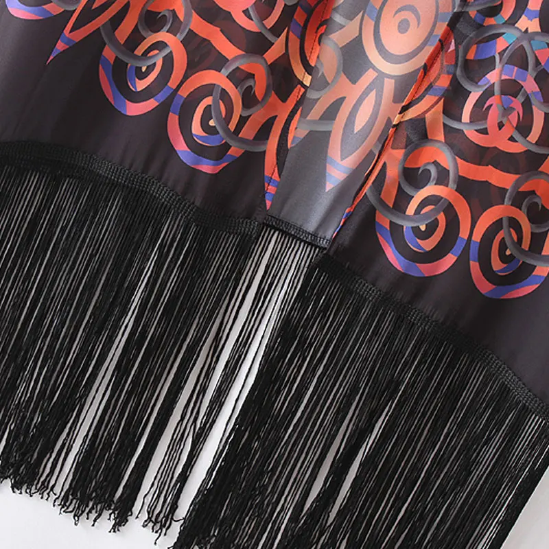 2017 Vintage Women Chiffon Kimono Cardigan Geometric Print Beach Wear Fringed Tassels Loose Boho Outerwear Beach Cover Up Black