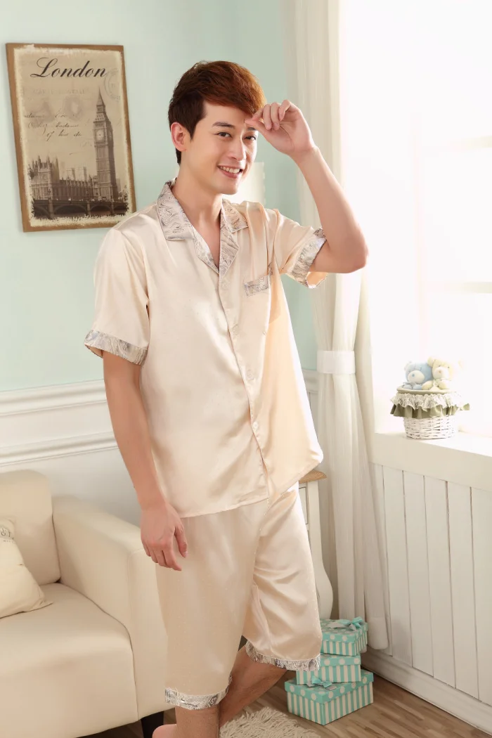 Item Type: Pajamas;Gender: Men;Pattern Type: Solid;Sleeve Length(cm): Short;Material: Silk,Rayon;Closure Type: Button;Collar: V-Neck;Brand Name: DecisionTree;Closure Type: Elastic Waist;Sleeve Style: Regular;Style: Casual;