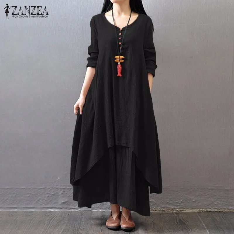 2017 ZANZEA Women Casual Solid Spring Dress Loose Full Sleeve V Neck Button Dress Cotton Linen Boho Long Maxi Dress Vestidos