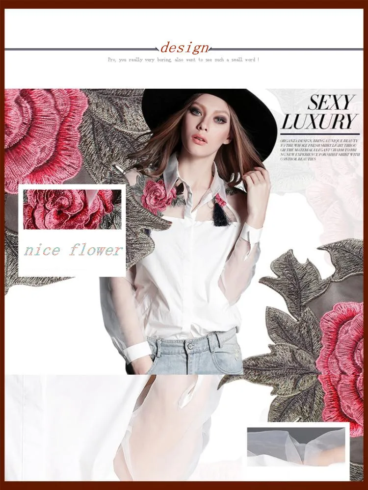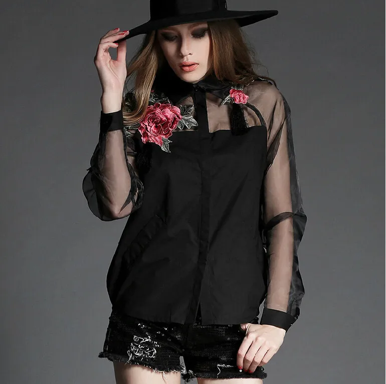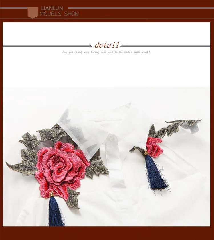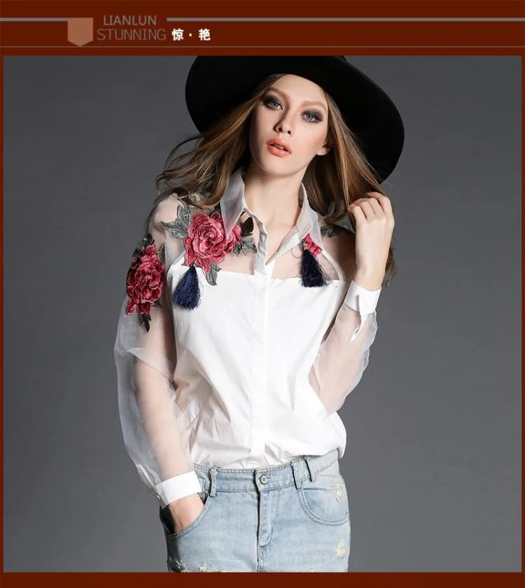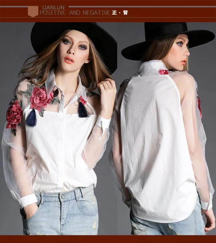 3D Flower Embroidery Blouses For Women 2017 Brand New Tops Summer Style Organza Patchwork Long Sleeve White Blouse Shirt Female