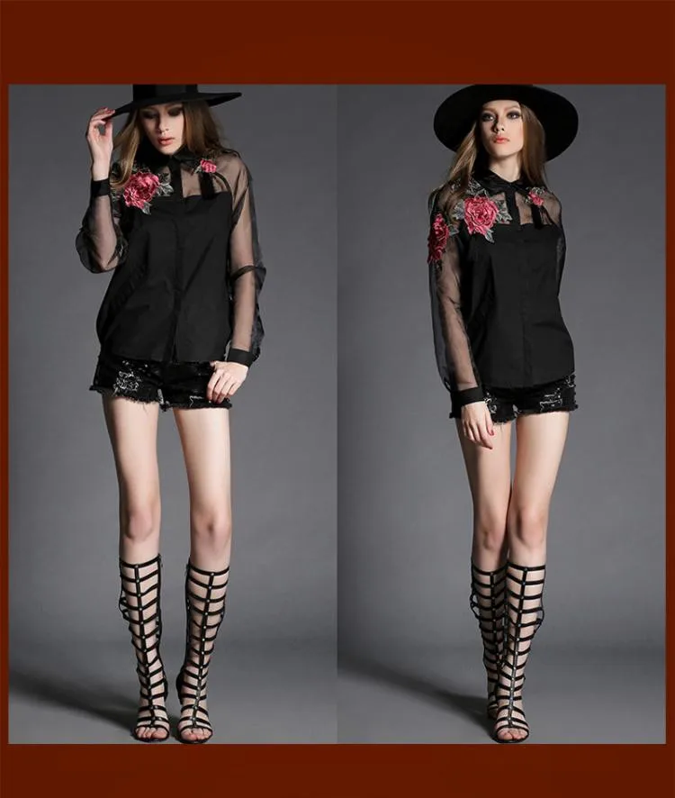 2015 new fashion arrival polo women white and black blouse turn-down collar embroidery organza cotton shirts hot sale women tops