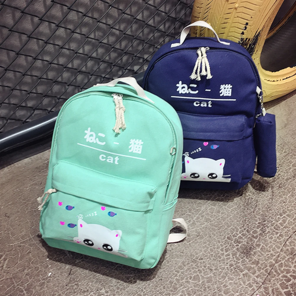 5pcs Preppy Casual Shoulder Bag Clutch Bag Drawstring Women Travel Rucksack Style Students Canvas Cat Backpack Teenager Girls