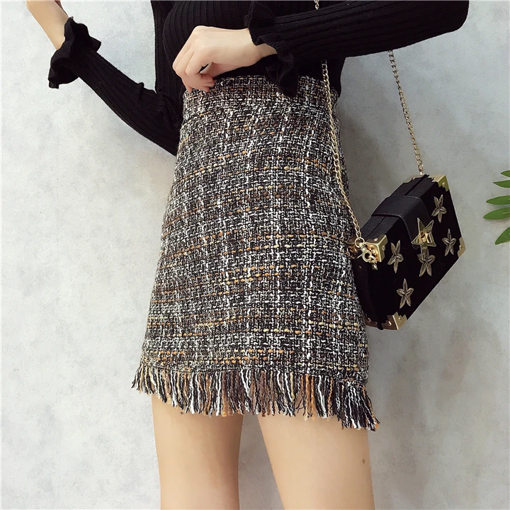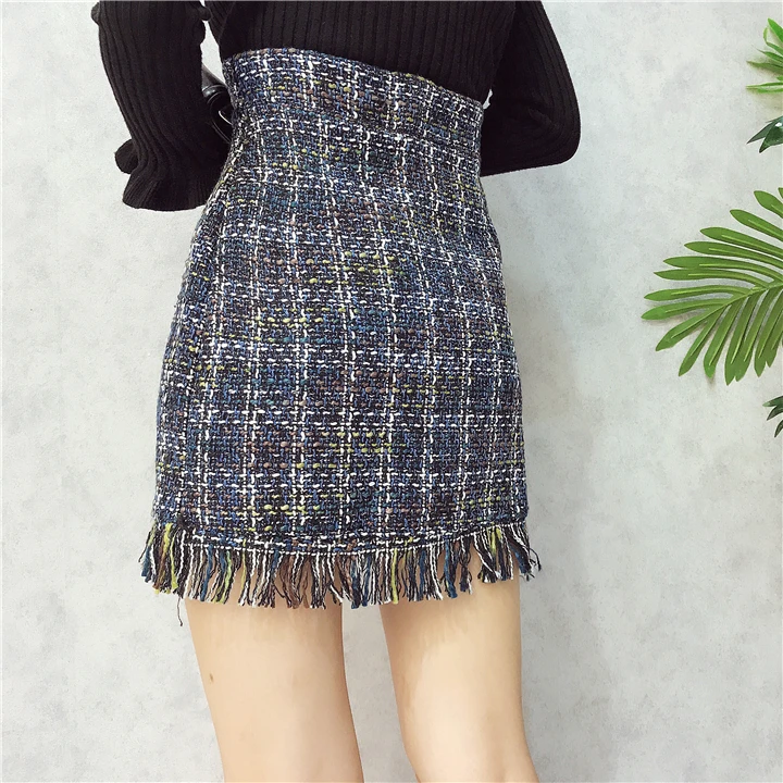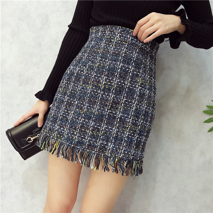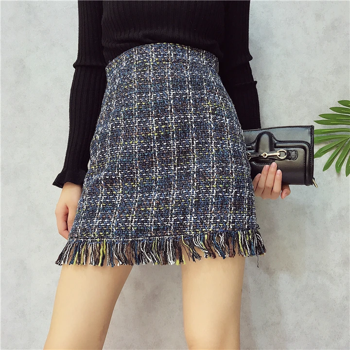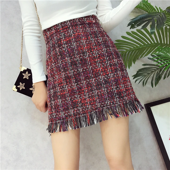 Autumn Winter Women Wool Tweed Skirt Korean Slim Tassel Short Plaid Woolen Skirt Ladies A-line Sexy Mini Skirts Red Blue black