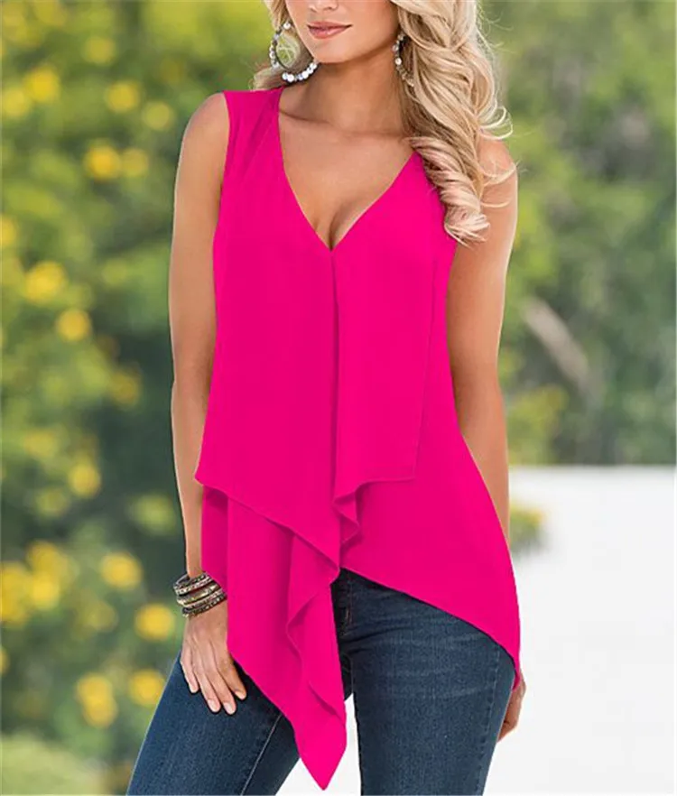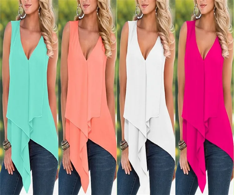 Awaytr Fascinating Summer Women Blouse Loose Shirt Deep V Neck Irregular Hem Chiffon Sleeveless Blouse Female Plus Size Shirt
