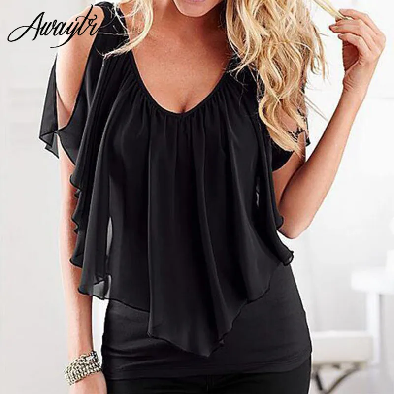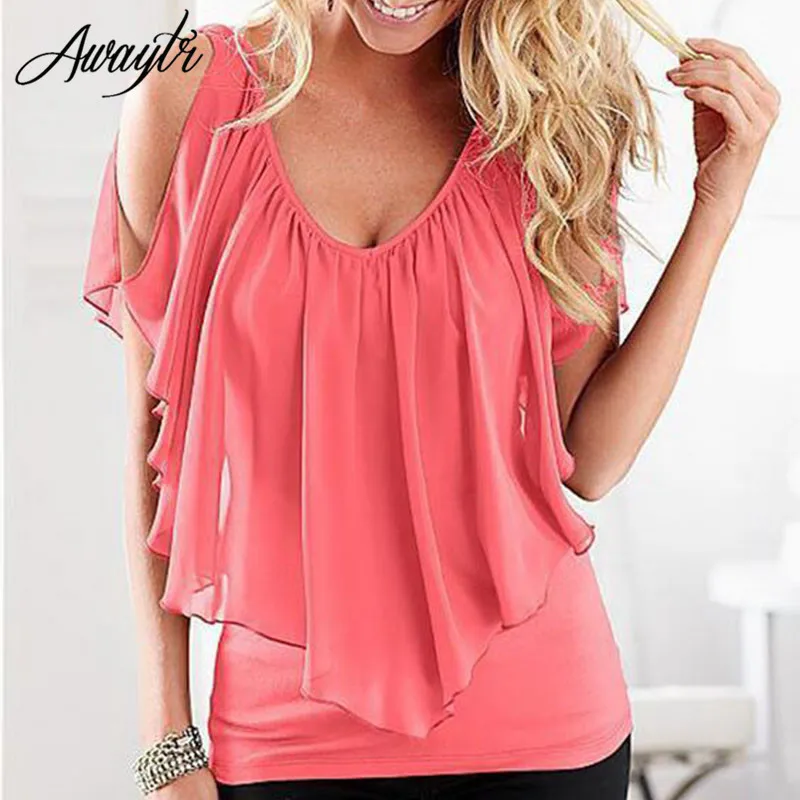 TItle:Awaytr New Ruffles Women Tops Fashion 2017 Womens Summer Chiffon Blouse Plus Size XXL Batwing Short Sleeve Casual Shirt