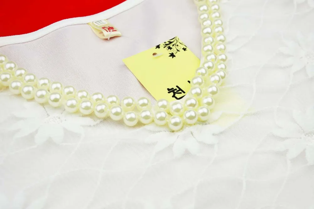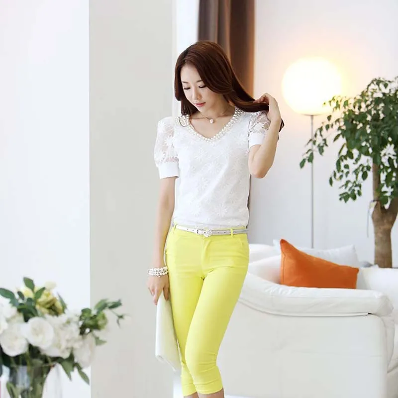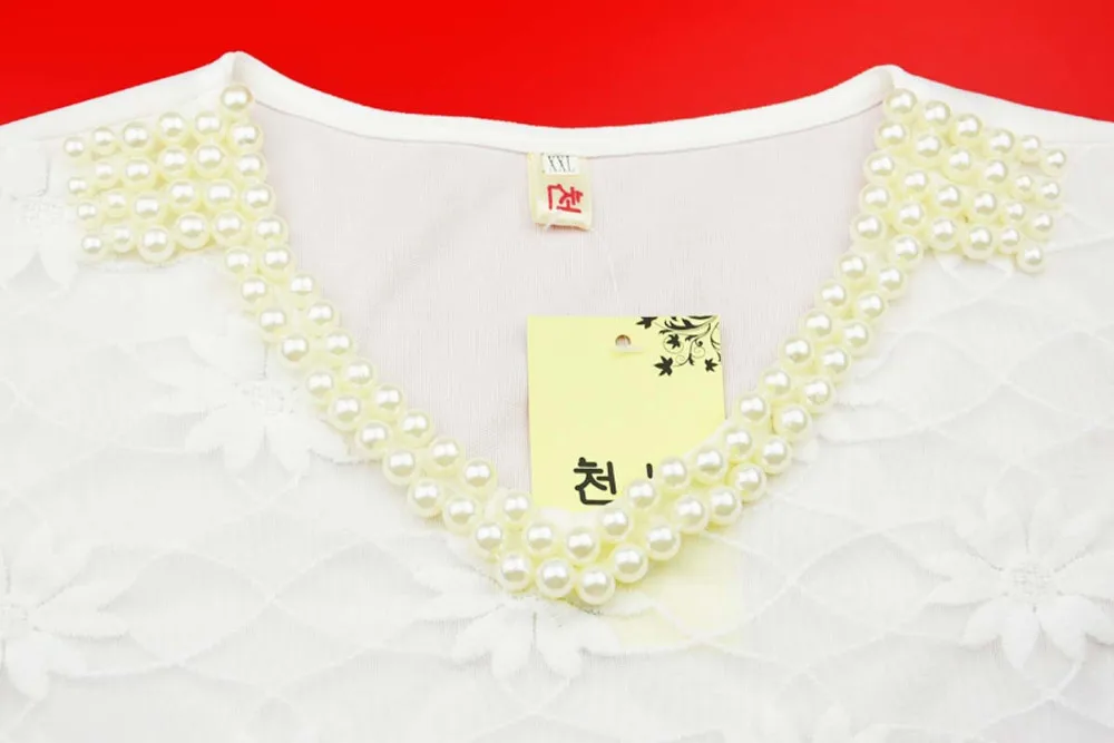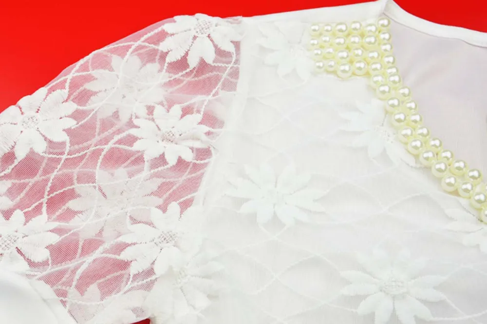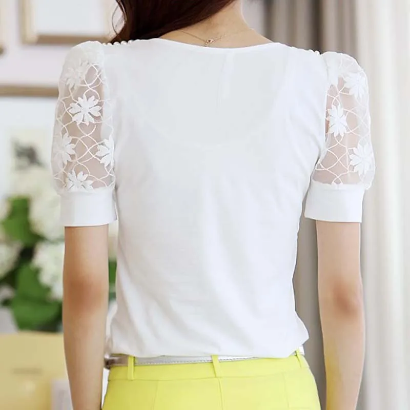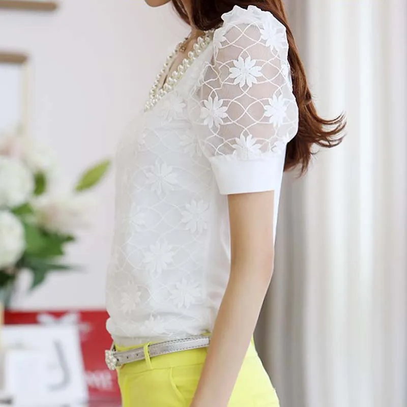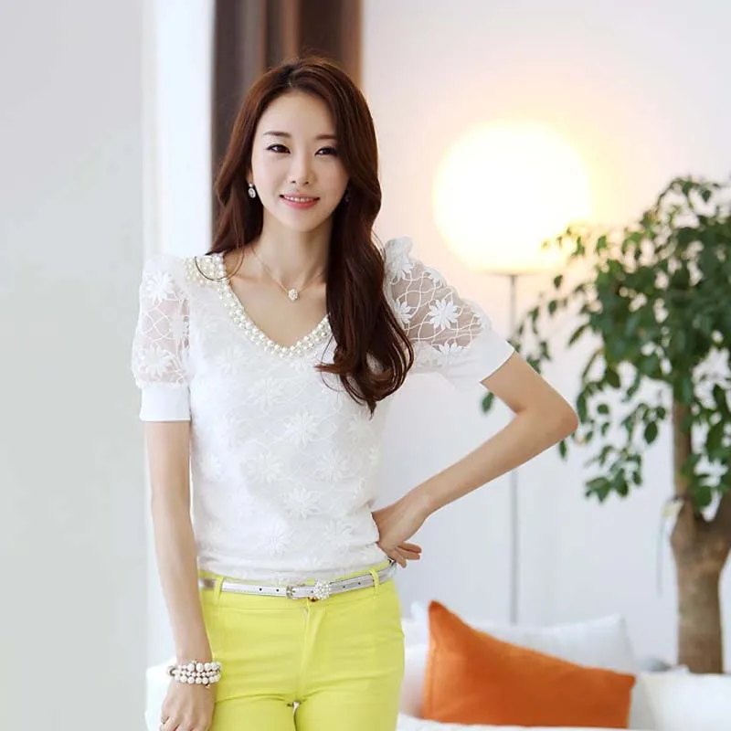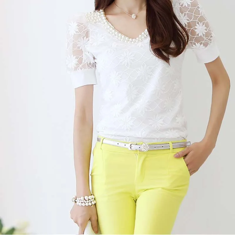 Beading Lace Blouse Women Short Sleeve Top Office Clothes 2017 Korean Style Summer Elegant Pearl V-neck Ladies Shirt Female 2016
