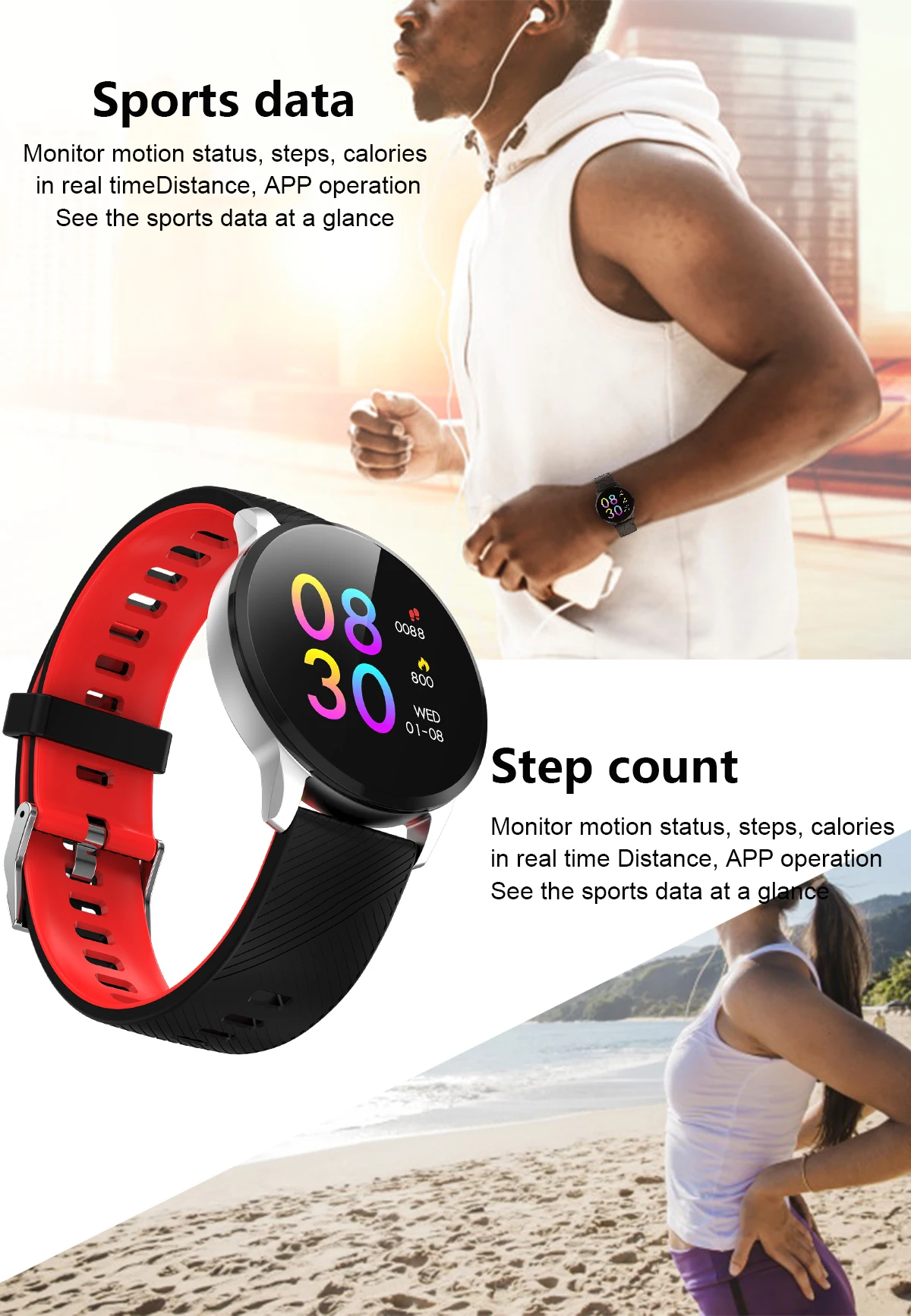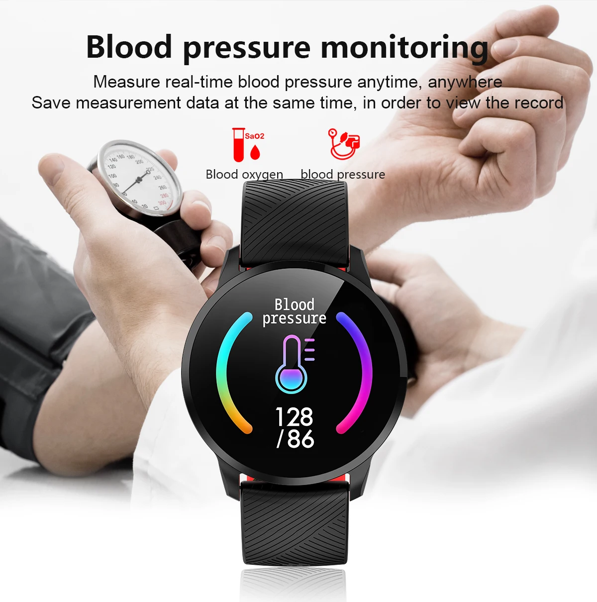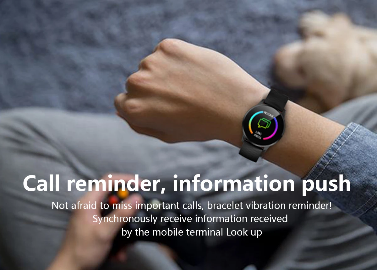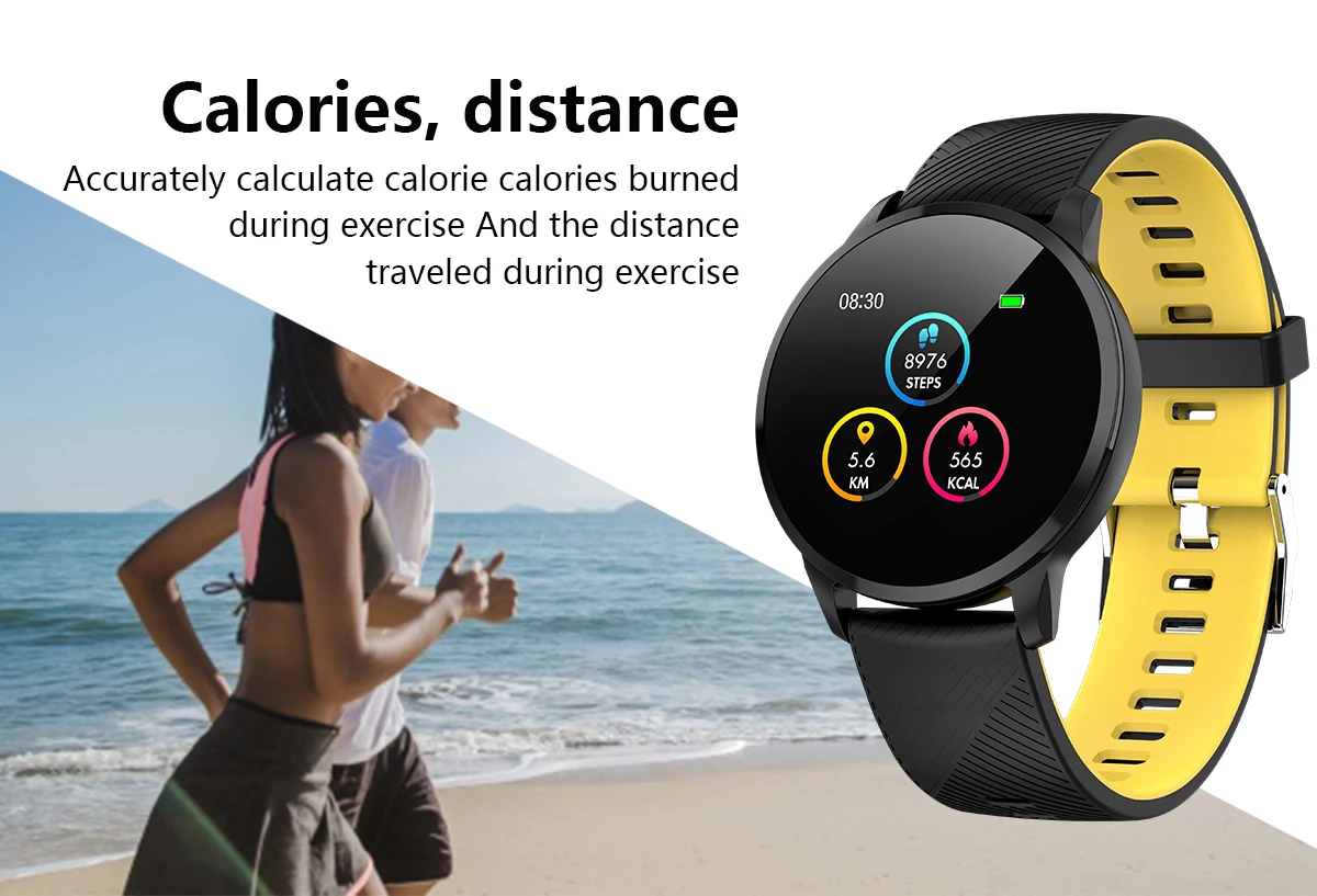 Main functions: Motion recording (step counting, distance, calorie calculation), sports mode, message push, information storage, heart rate monitoring, sleep monitoring, blood pressure measurement, blood oxygen saturation measurement, stopwatch, photo control, music control, full font language , 1.3-inch color display.