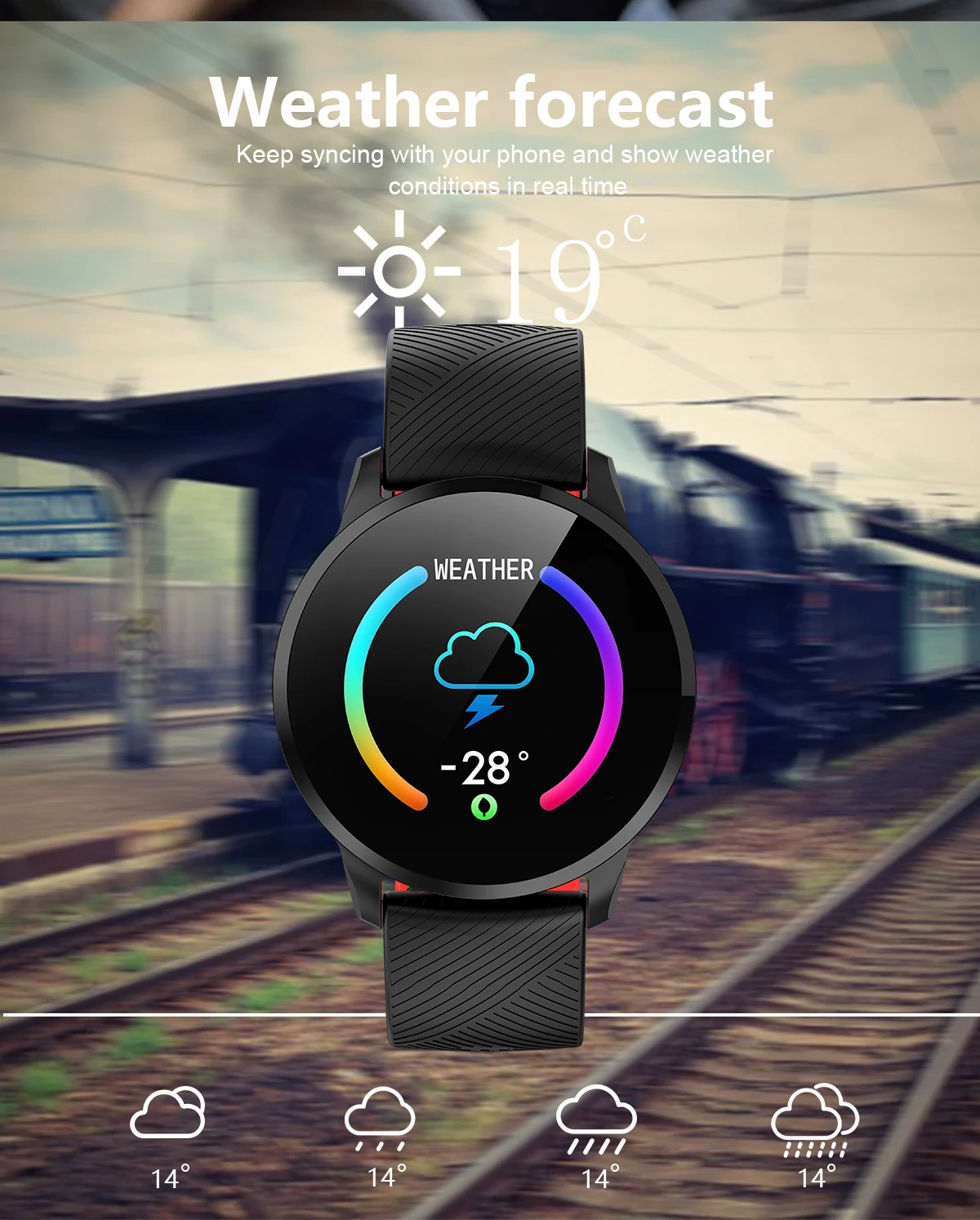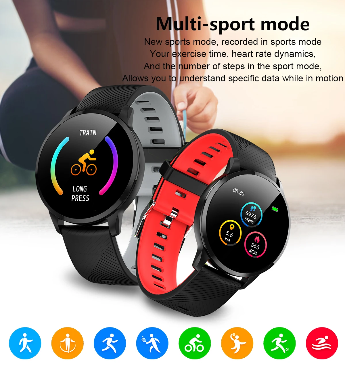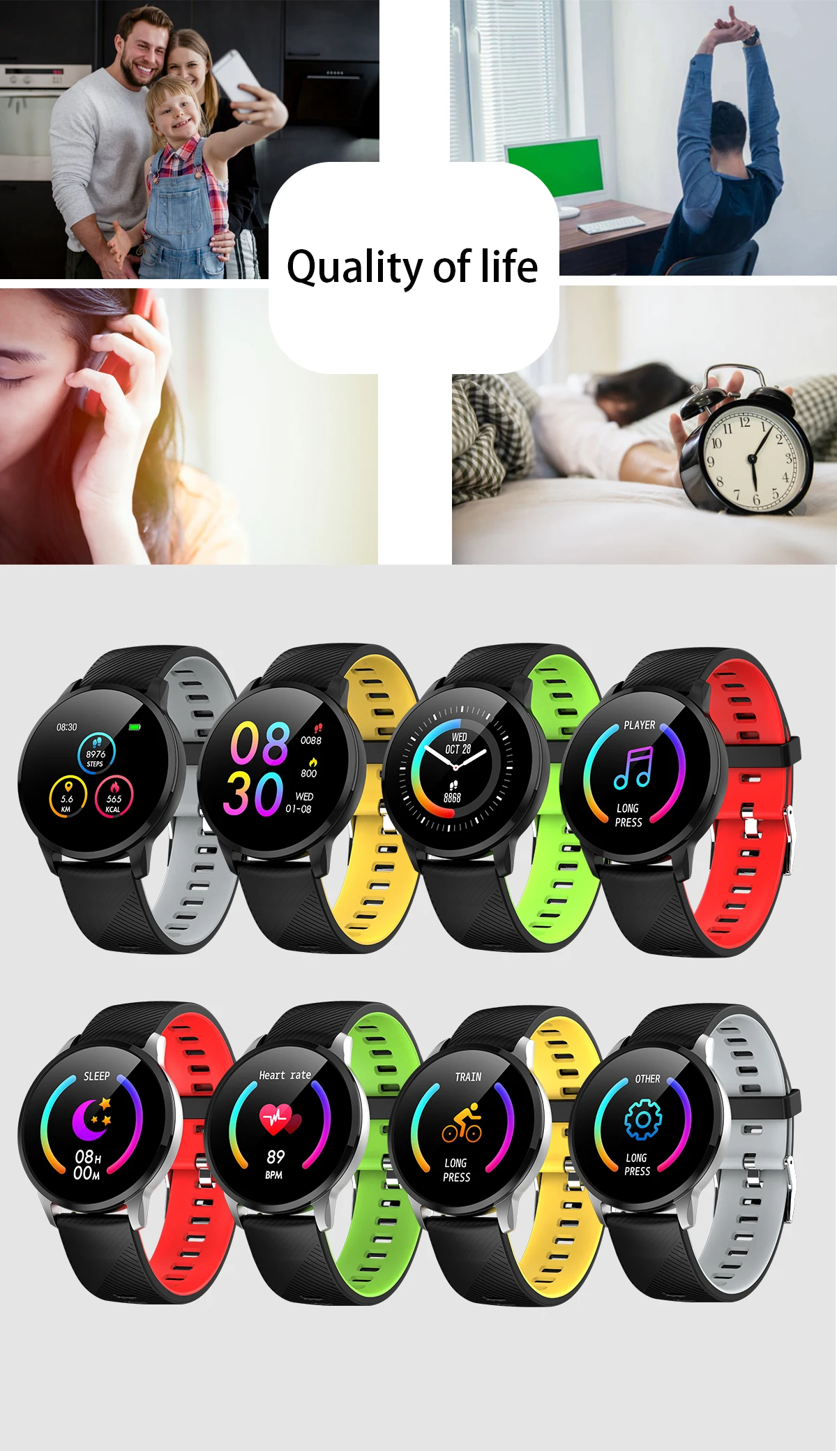 Main functions: Motion recording (step counting, distance, calorie calculation), sports mode, message push, information storage, heart rate monitoring, sleep monitoring, blood pressure measurement, blood oxygen saturation measurement, stopwatch, photo control, music control, full font language , 1.3-inch color display.