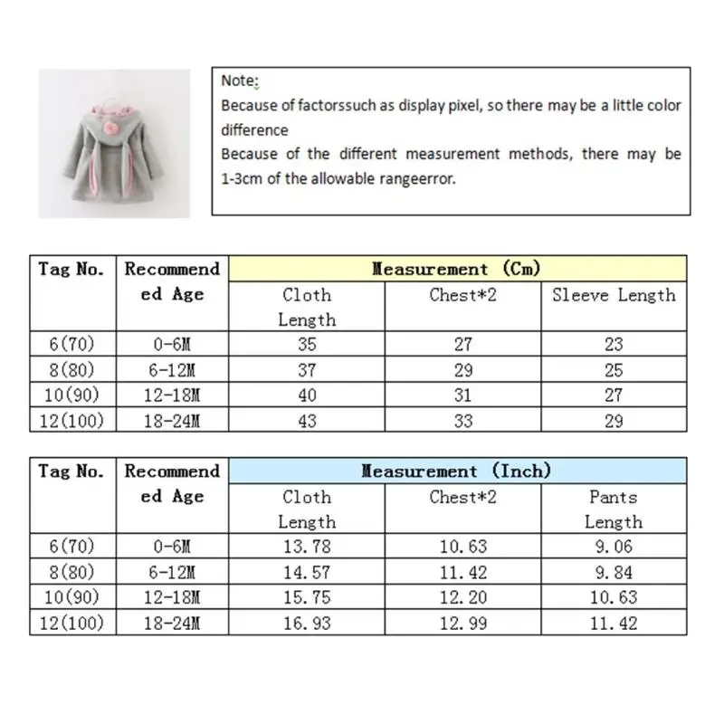 Specification: Color: red, gray, pink Material: cotton polyesterGender: Girl Season: autumn and winter Sleeve: long sleevePlease check the size table carefully: Size Age Cloth Length Chest*2 Sleeve Length 6(70) 0-6M 35cm/13.78" 27cm/10.63" 23cm/9.06" 8(80) 6-12M 37cm/14.57" 29cm/11.42" 25cm/9.84" 10(90) 12-18M 40cm/15.75" 31cm/12.2" 27cm/10.63" 12(100) 18-24M 43cm/16.93" 33cm/12.99" 29cm/11.42"