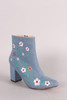 Denim Embroidered Floral Vines Chunky Heeled Booties