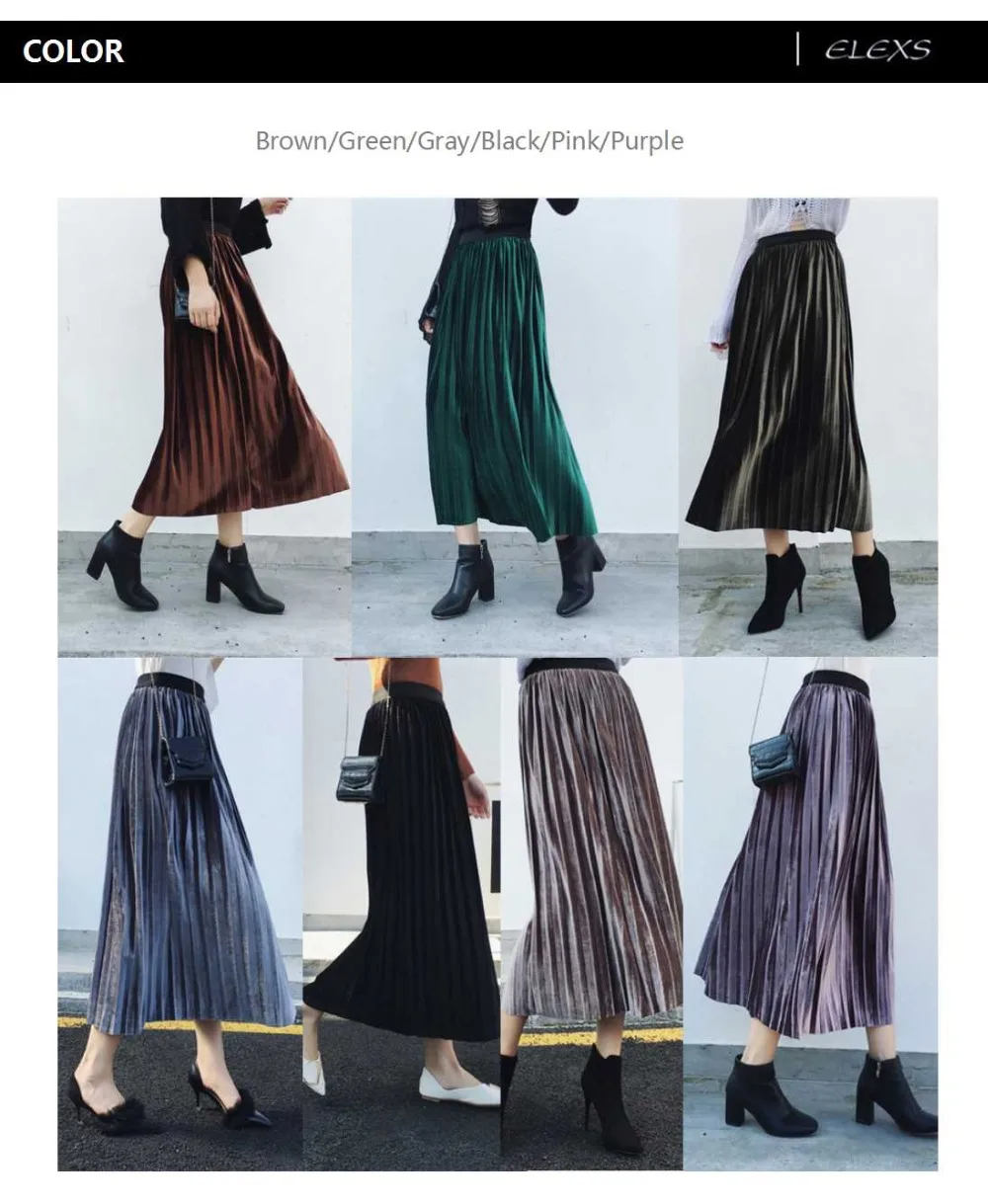 ELEXS Autumn Winter Fashion Skirt High Waist Velvet Pleated Skirt Women Solid Elastic Waist Spring Long Skirt Female E7953