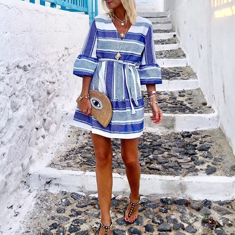 Fashion Casual V Neck Striped Bell Sleeves Dress
