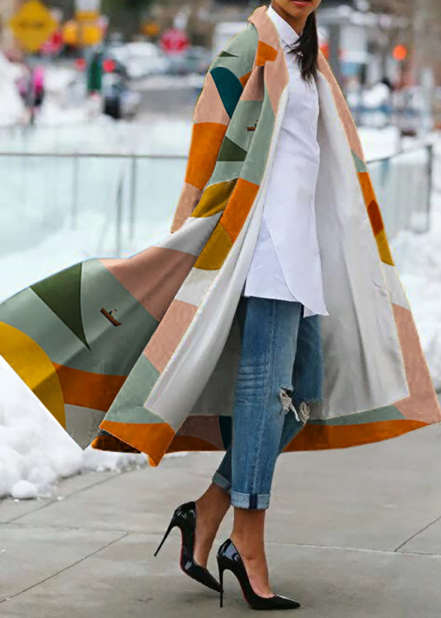 Fashion Turndown Collar Printed Colour Long Sleeve Slit Coat