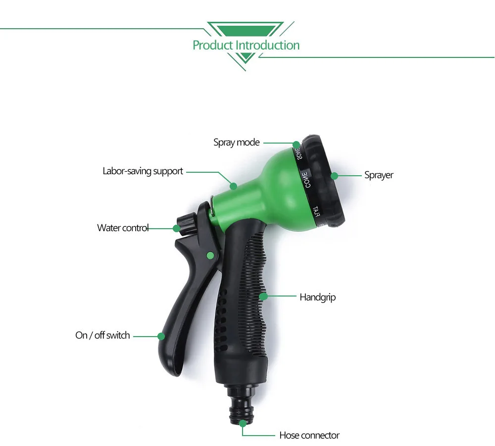 - 8 spraying water modes, full, angle, shower, mist, center, flat, cone, soaker, choose the optimal mode you need.