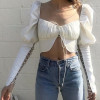 High Waist Square Collar Puff Sleeve Women Shirts Fashion Casual Tie Spring Short Crop Tops
