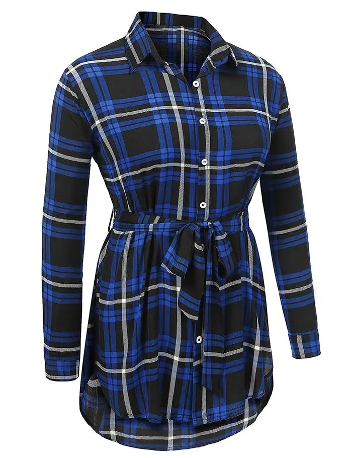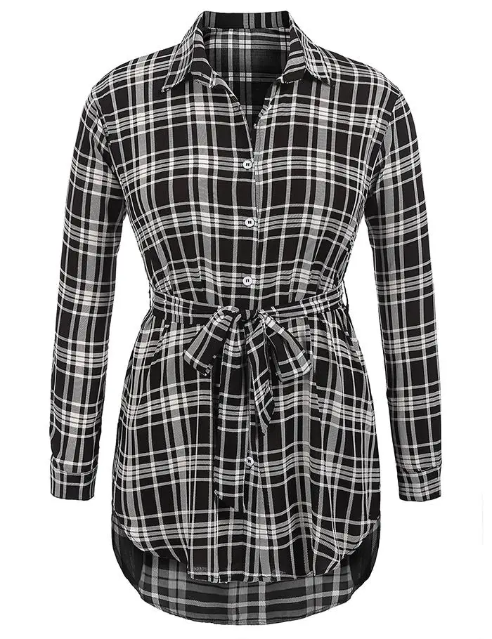 [Style] :IN'VOLAND Women Blouse Blusas Tops Plus Size XL-5XL Spring Autumn Pullovers Plaid Button Down Loose Shirt Tops Belt Oversized