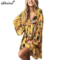 iShine Off the shoulder floral printed women sexy short beach boho dress vestidos flare sleeve slash neck women mini dress