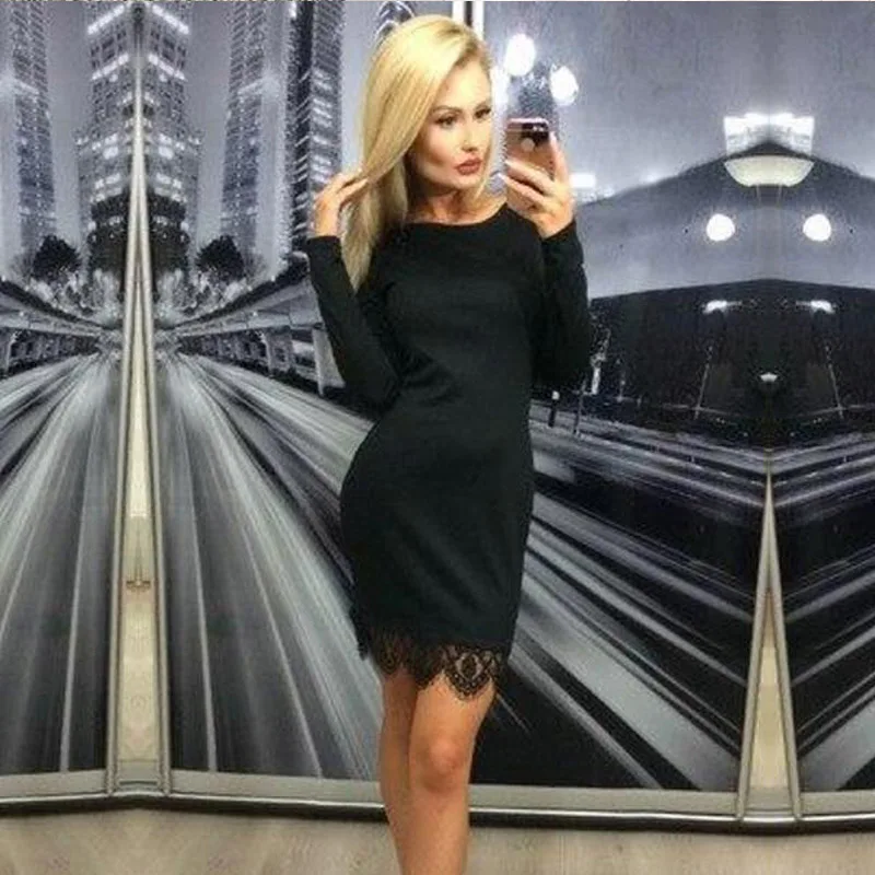 Lace Stitching Sexy Sheath Dress 2017 Autumn Women Fashion Bodycon Dress Long Sleeve O-neck Keep Warm Dresses