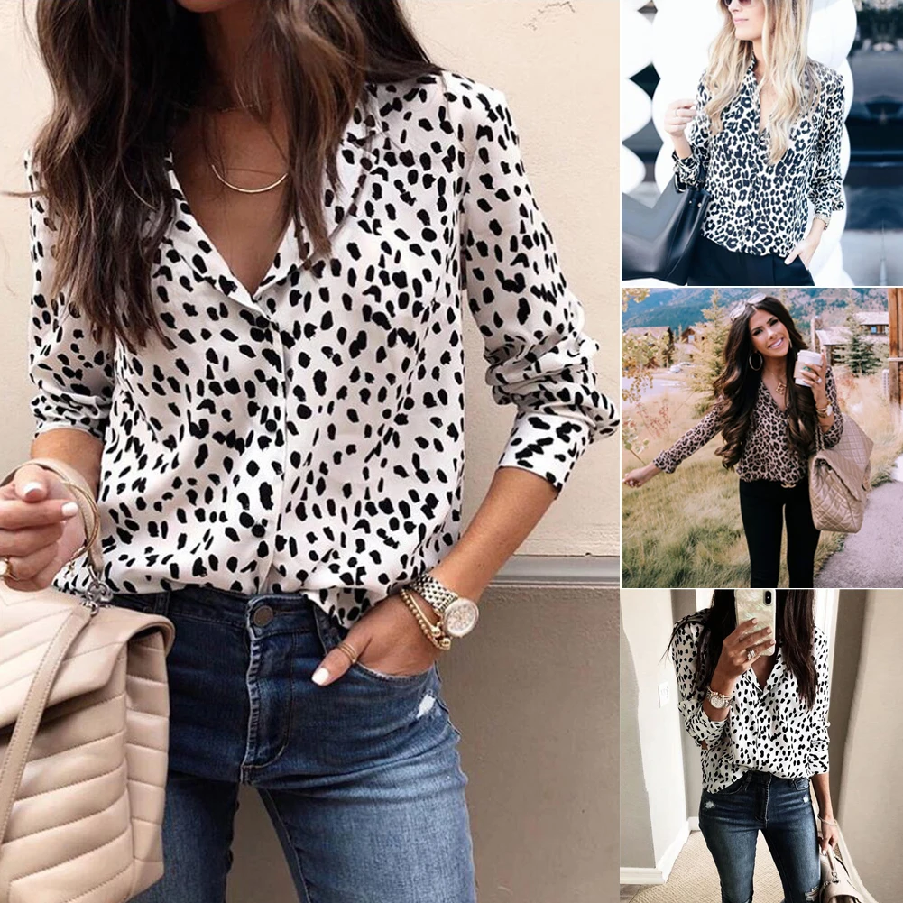 Leopard Print Blouse Long Sleeve Shirt Women V Neck Femme Buttons Casual shirt Top