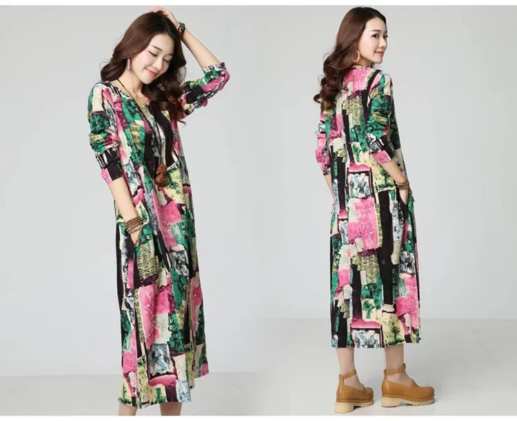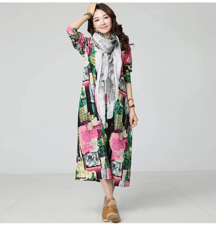 New Autumn Ethnic Print Cotton Linen women dress Long sleeve O-Neck Casual Loose Long Dresses robe