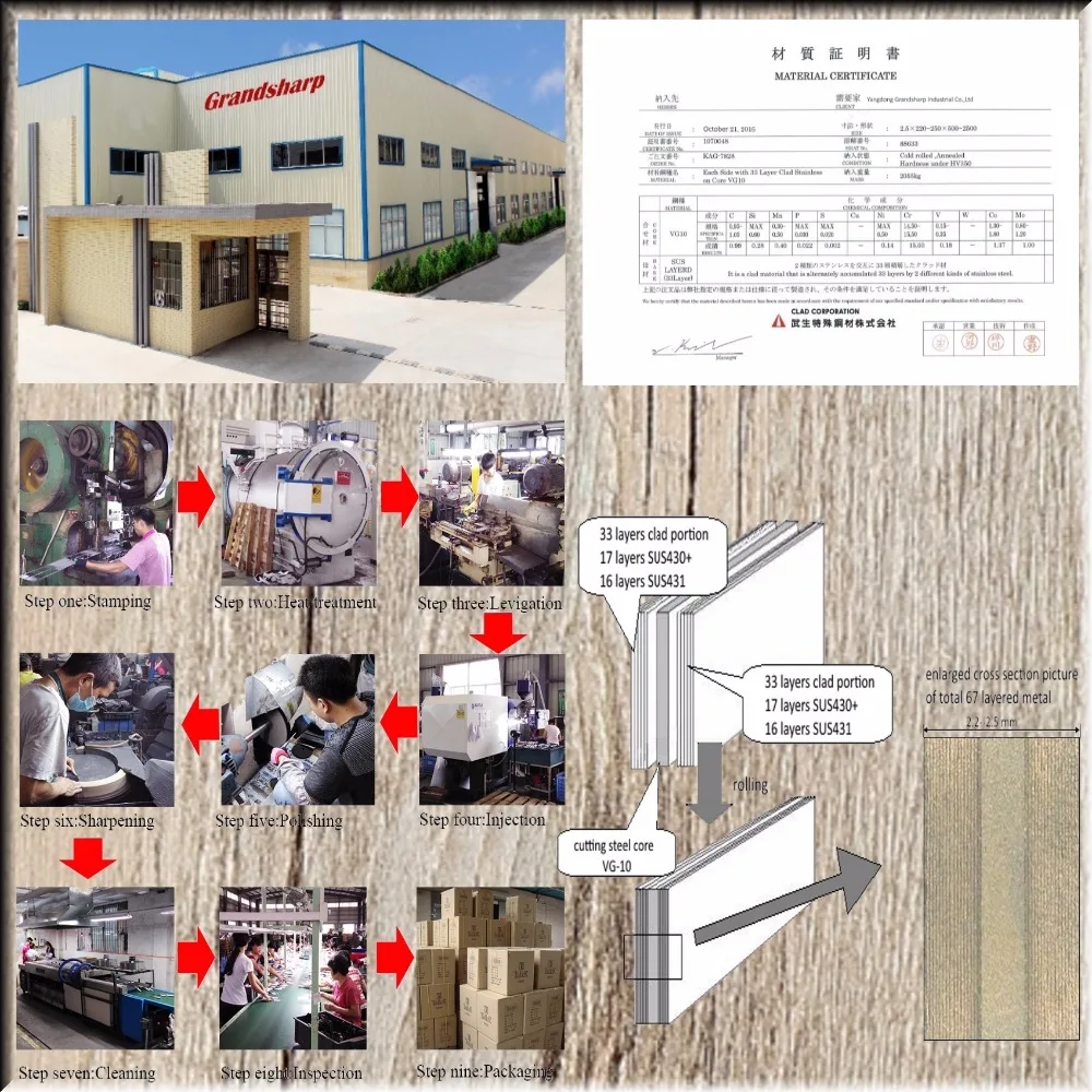 MADE from 67-layer Damascus Steel imported from Japan. VG-10 Steel cutting core; 33-layer of Stainless Steel SUS430&SUS431 on each side; HRC 60-62 hardness.