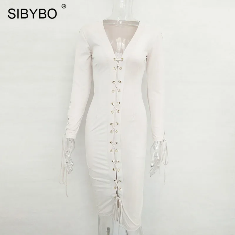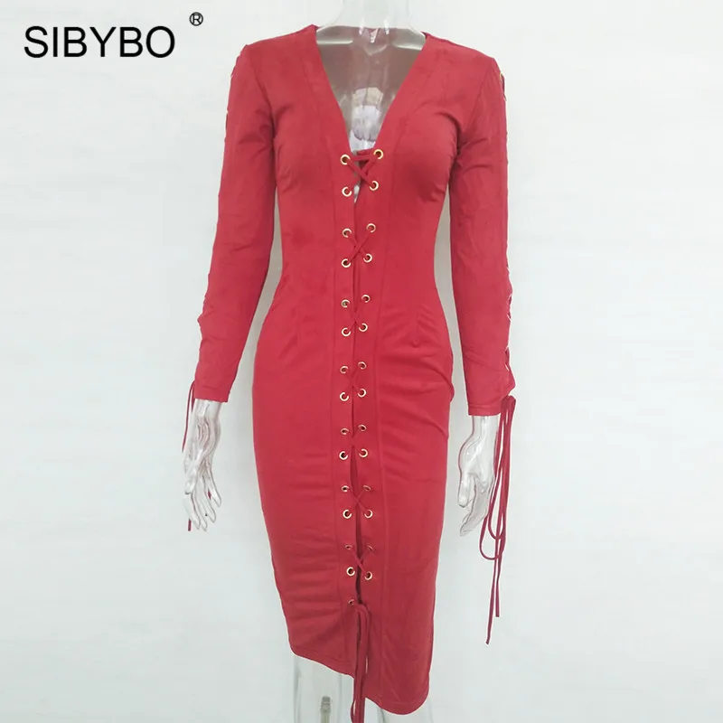 Tittle:Sibybo Sexy Leather Suede Lace Up Bandage Winter Autumn Dress Women Long Sleeve Slim Elegant Party Bodycon Dress Vestidos