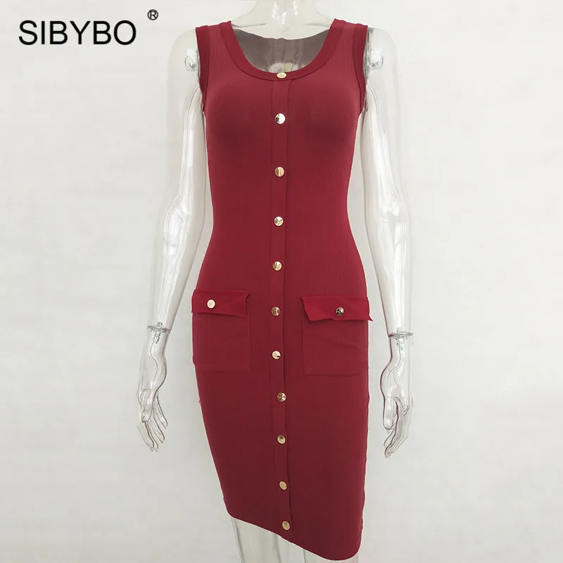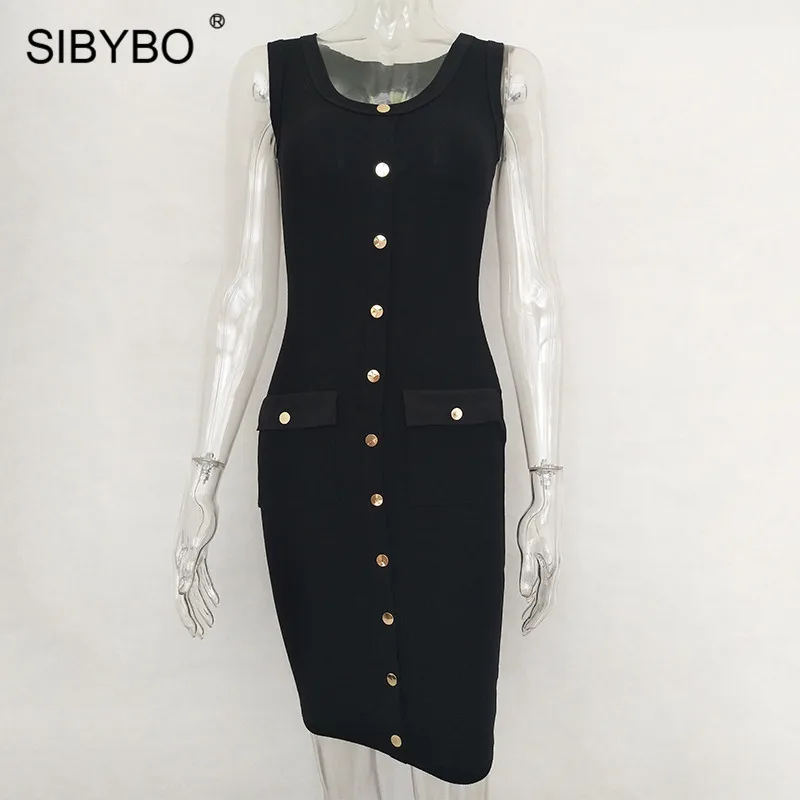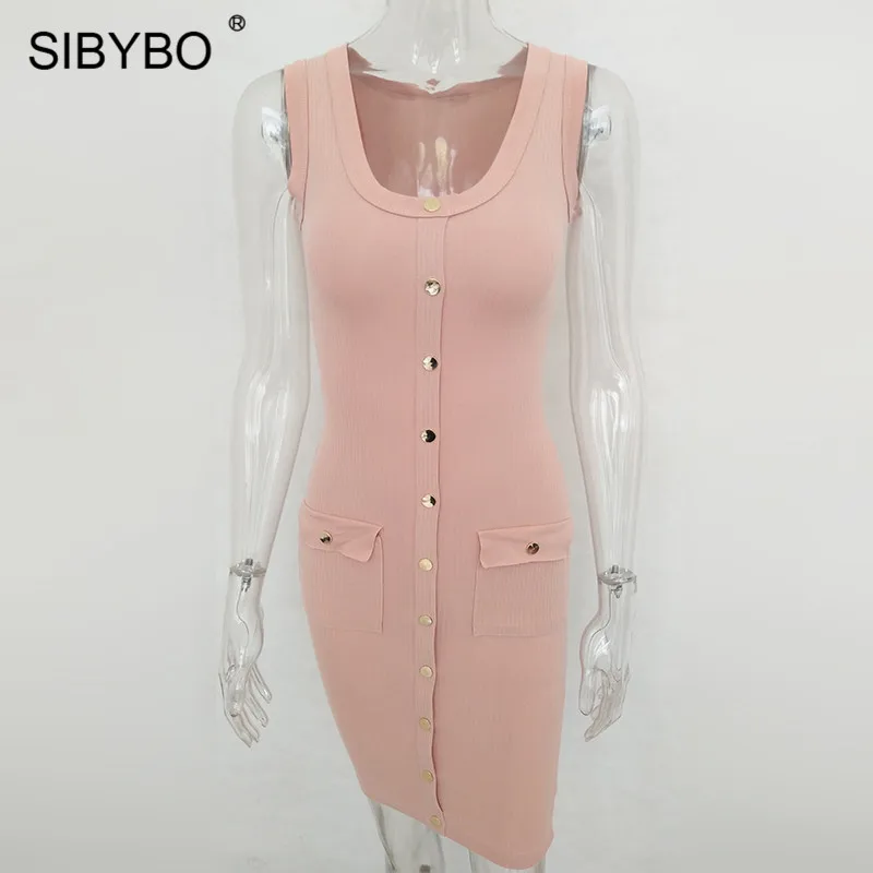 Tittle:Sibybo Sleeveless Knitted Sexy Bodycon Dress Autumn Winter O-Neck Sheath Cotton Dresses Women Pockets Mini Casual Dress Women