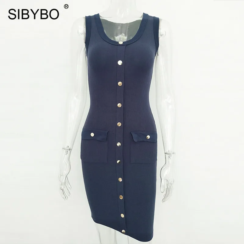 Tittle:Sibybo Sleeveless Knitted Sexy Bodycon Dress Autumn Winter O-Neck Sheath Cotton Dresses Women Pockets Mini Casual Dress Women