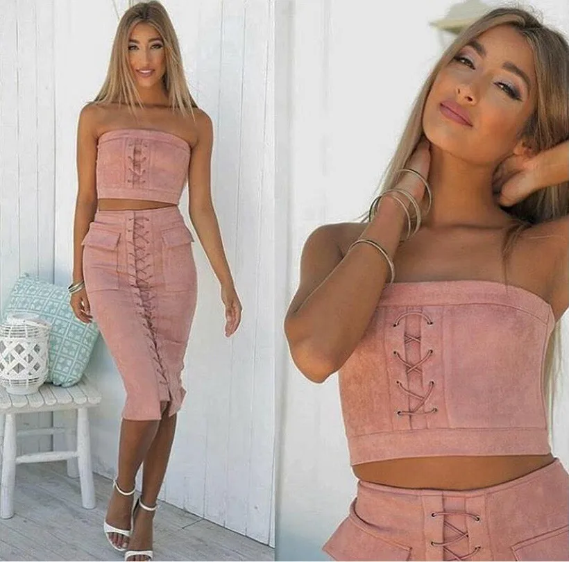 SIBYBO Suede Lace Up 2 Piece Set Women Dress Elegant Long two pieces Autumn Sexy Club Party Bandage Bodycon Dress Vestidos