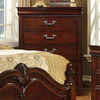 Keep it simple yet refined with this beautifully finished bedroom chest. The chest features five spacious drawers with beautiful antique handles that add an air of sophistication to the entire piece. A hidden felt-lined drawer is also included along the upper molding to offer a home for any valuables or delicates. Charming nail head trim lines the bottom of the hidden drawer to match the stylish handles while the entire piece is coated in a delightful cherry brown finish to highlight the solid wood craftsmanship.