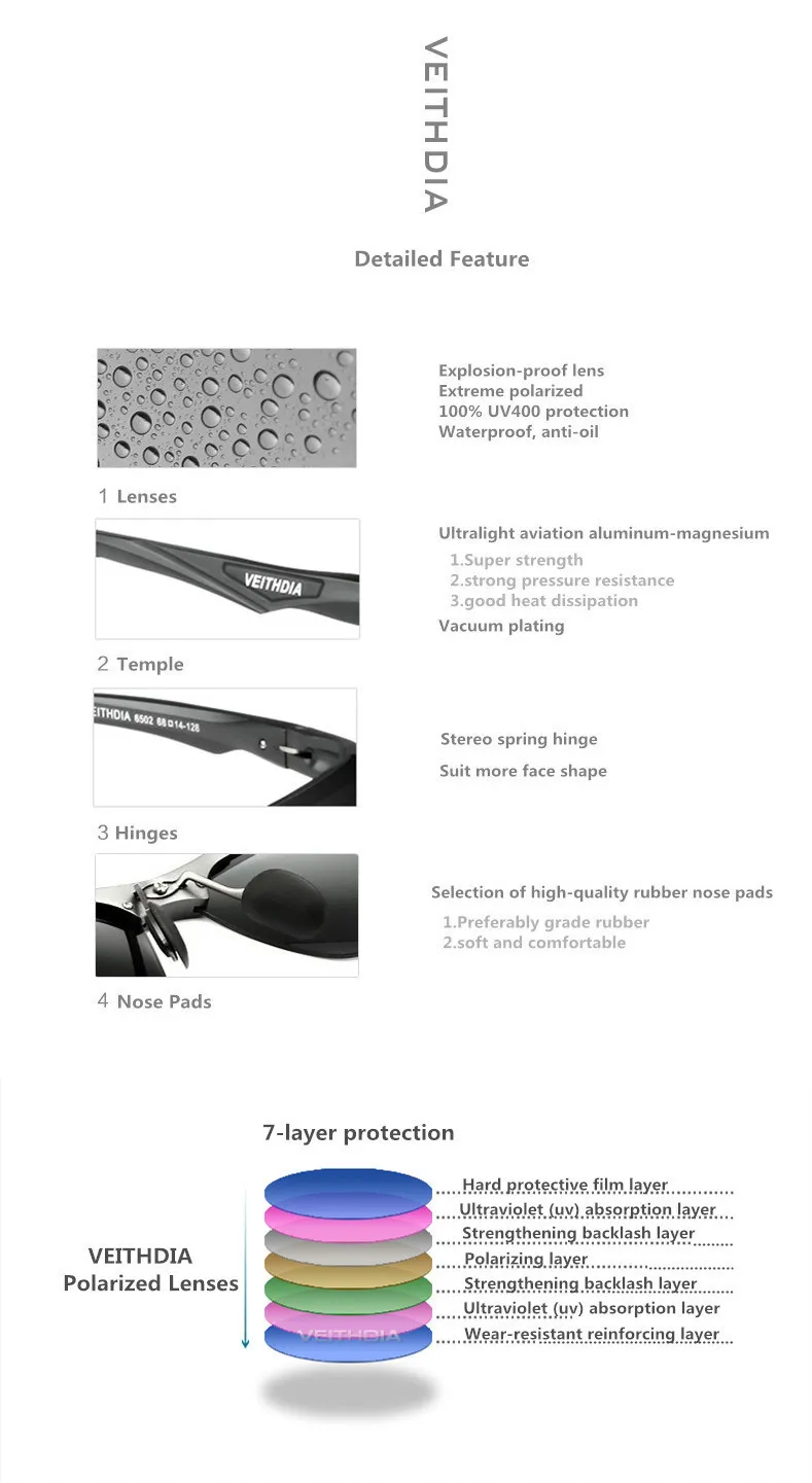 VEITHDIA Luxury Brand Mens Polarized Sunglasses Goggles UV400 Sun Glasses High Quality Original Brand Designer